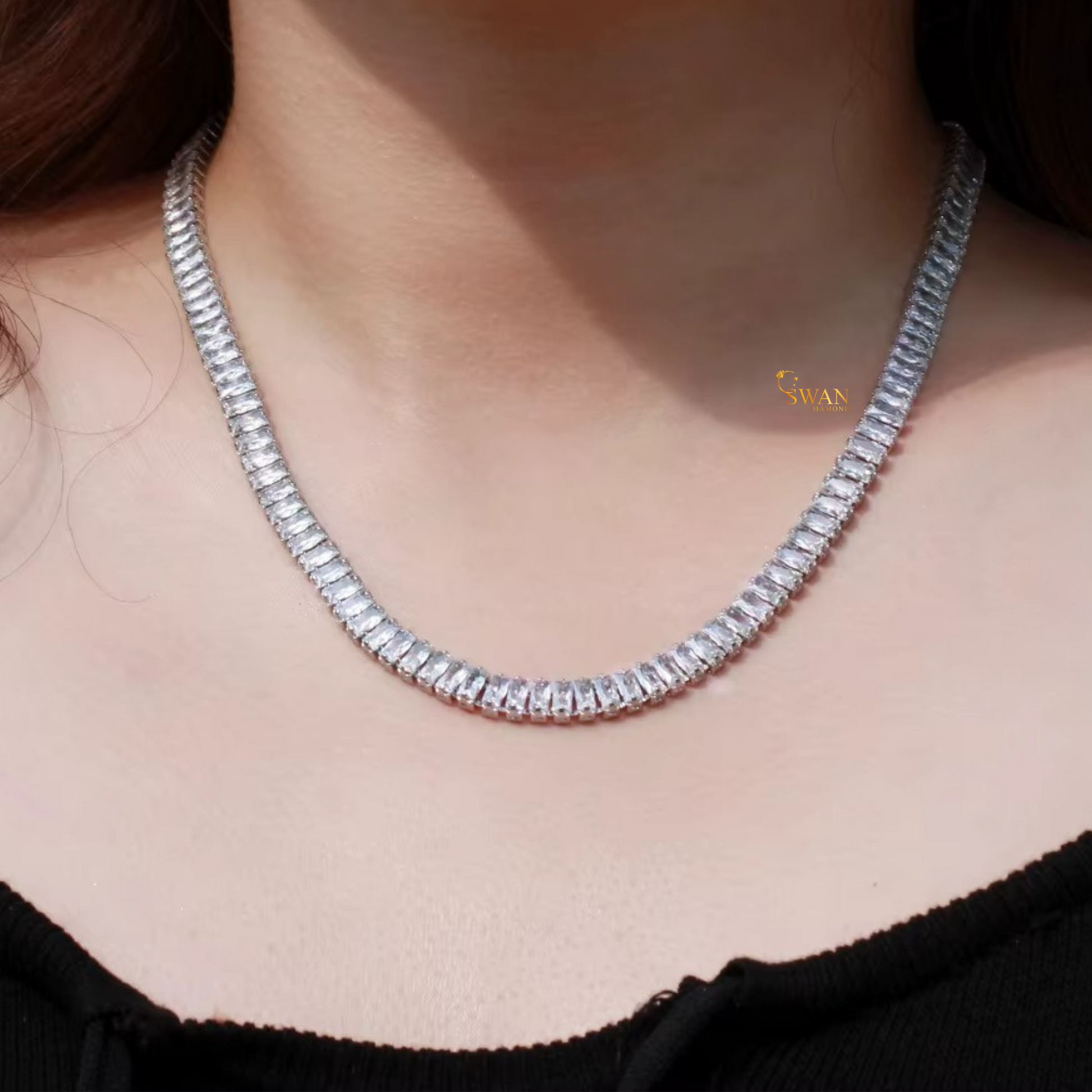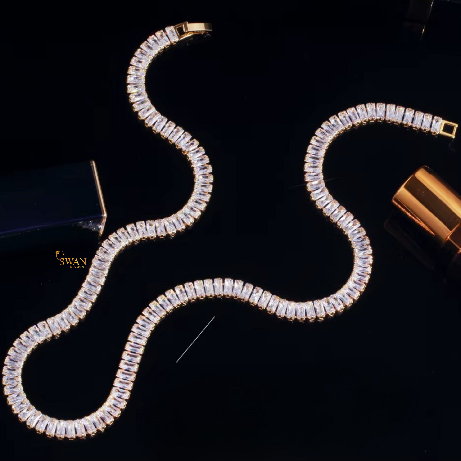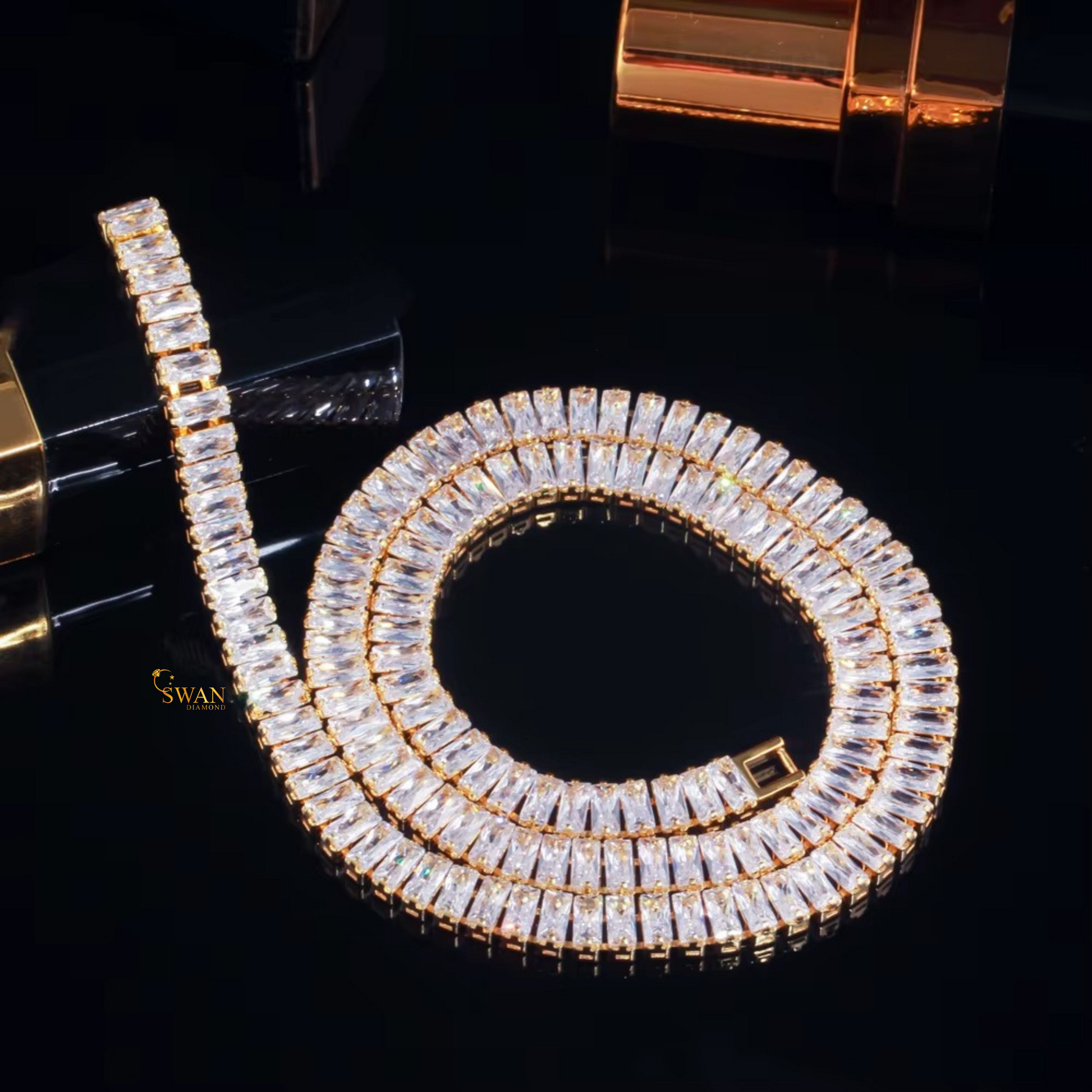 Baguette Cut Diamond Tennis Necklace in White and Yellow Gold Luxury Statement Jewelry for Men and Women swandiamond