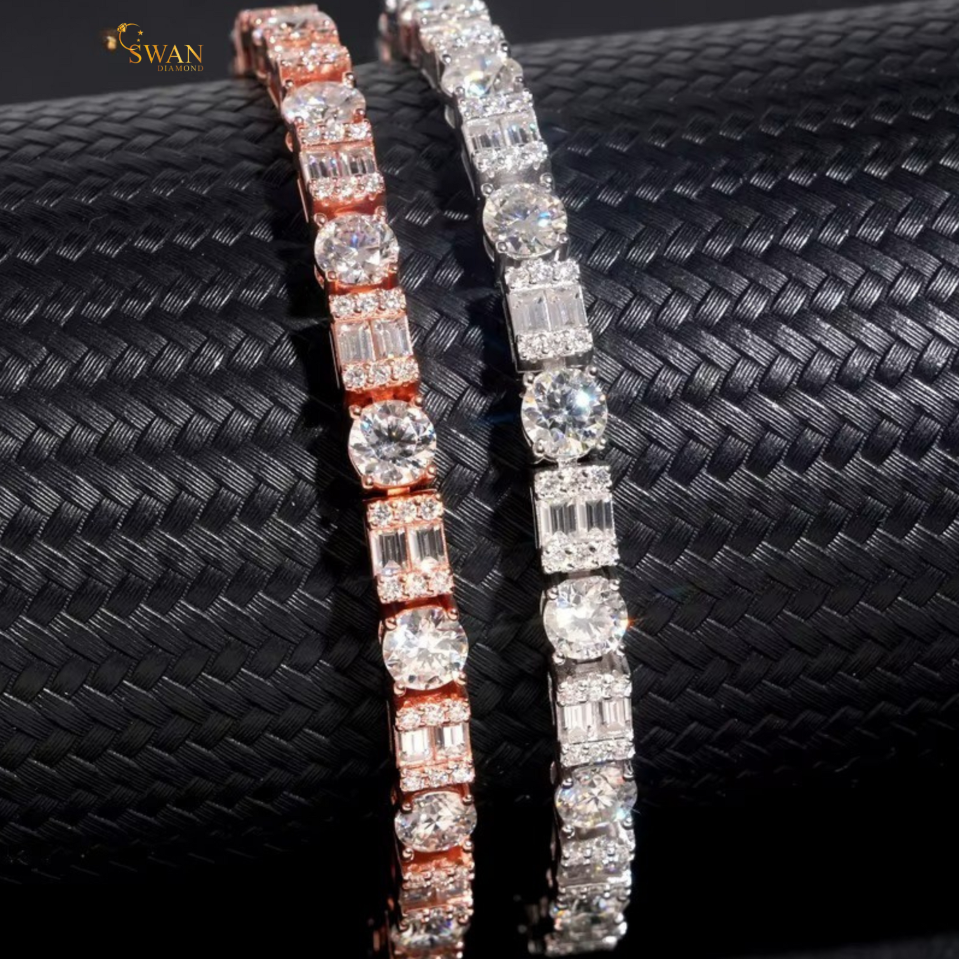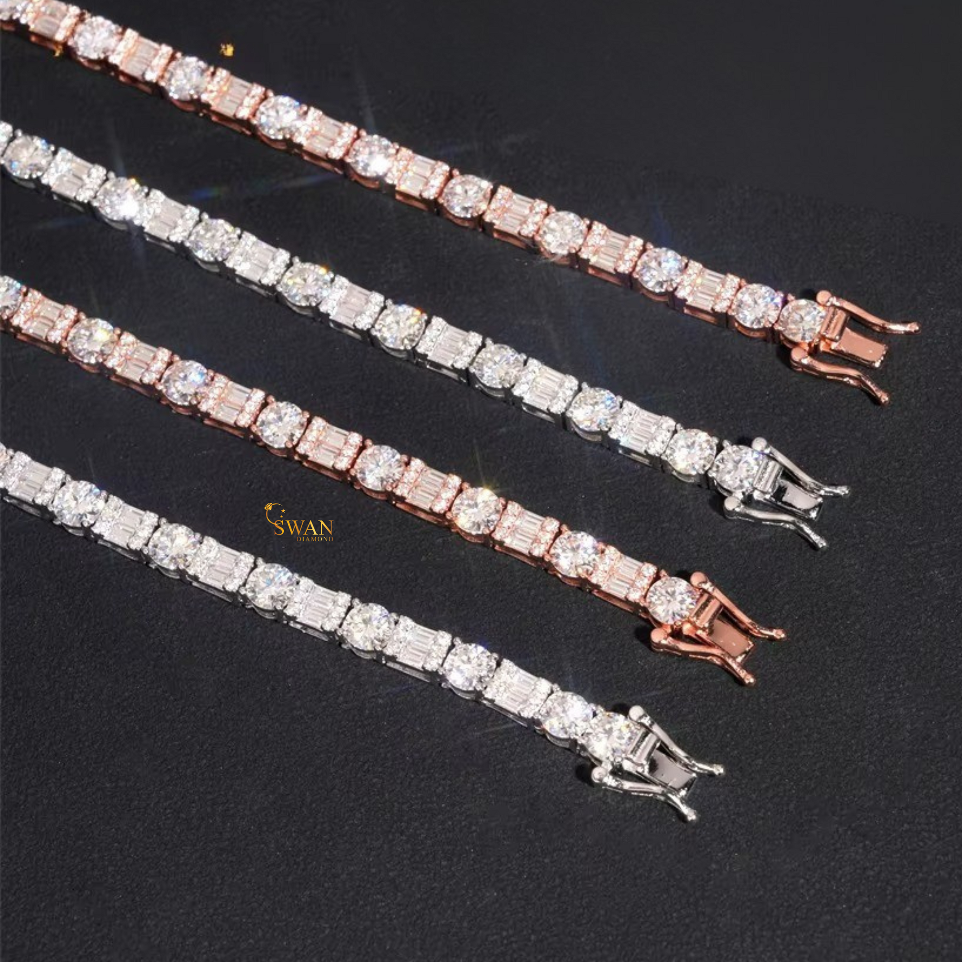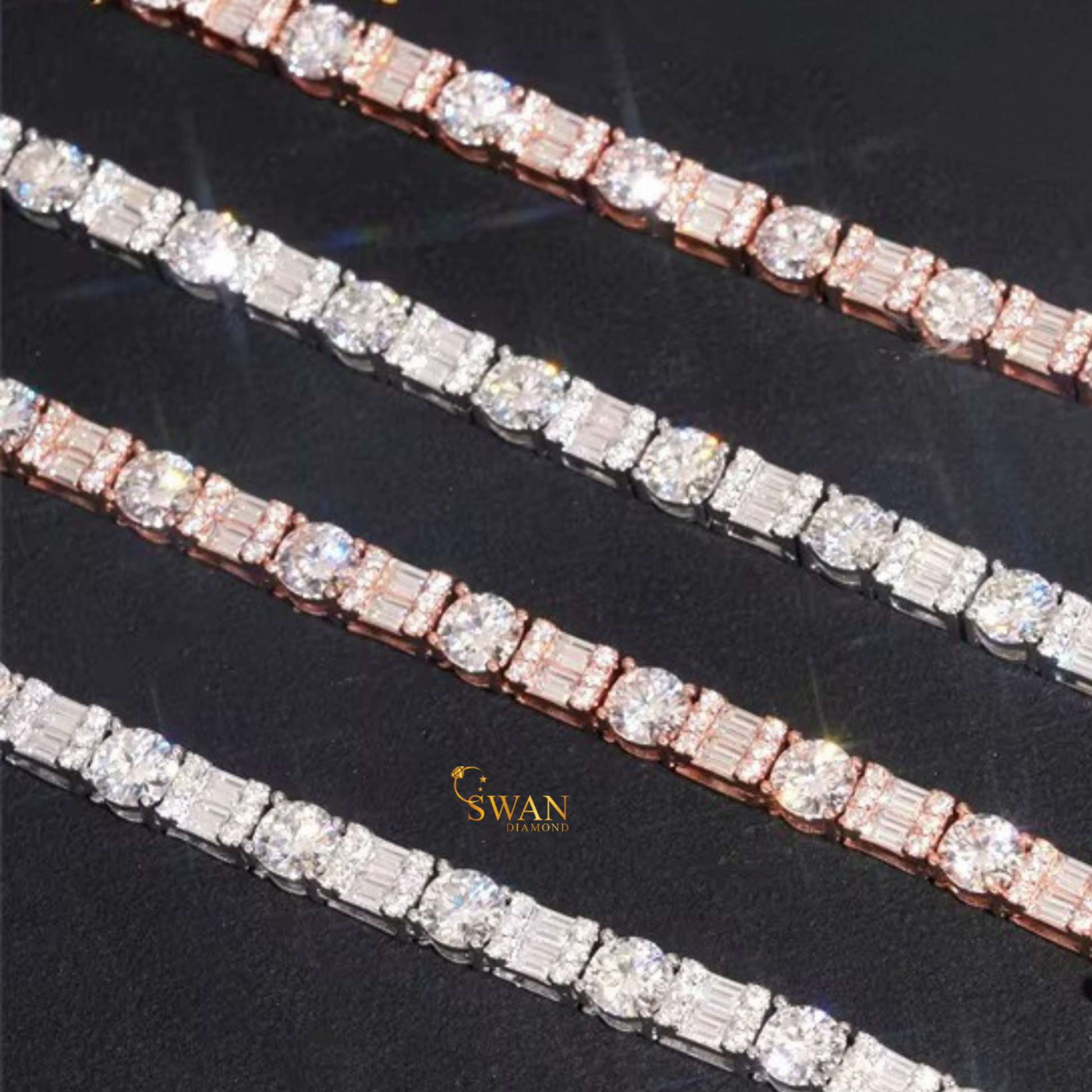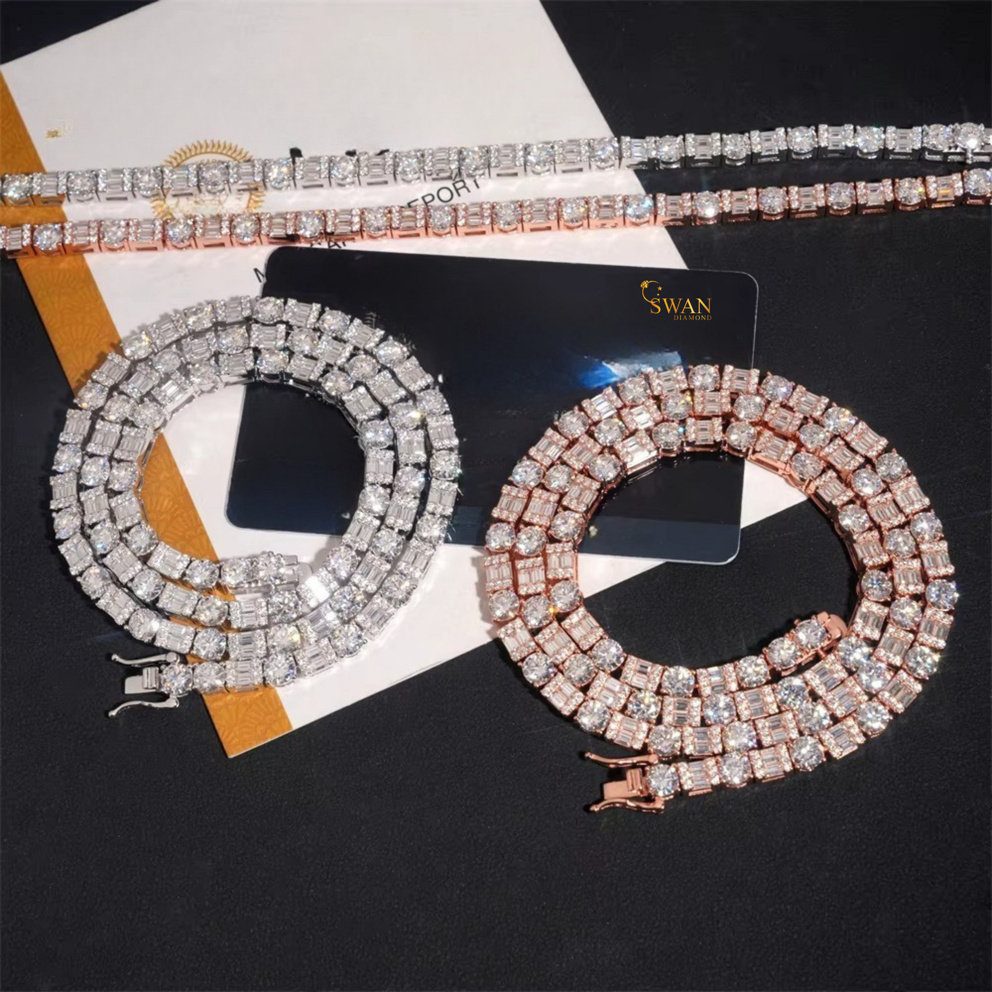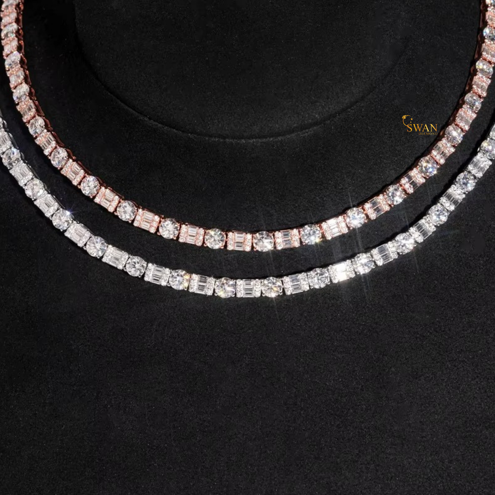 Round and Baguette Cut Natural Diamond Tennis Chain in Rose Gold Two Row Iced Out Statement Necklace Luxury Fine Jewelry for Men and Women swandiamond