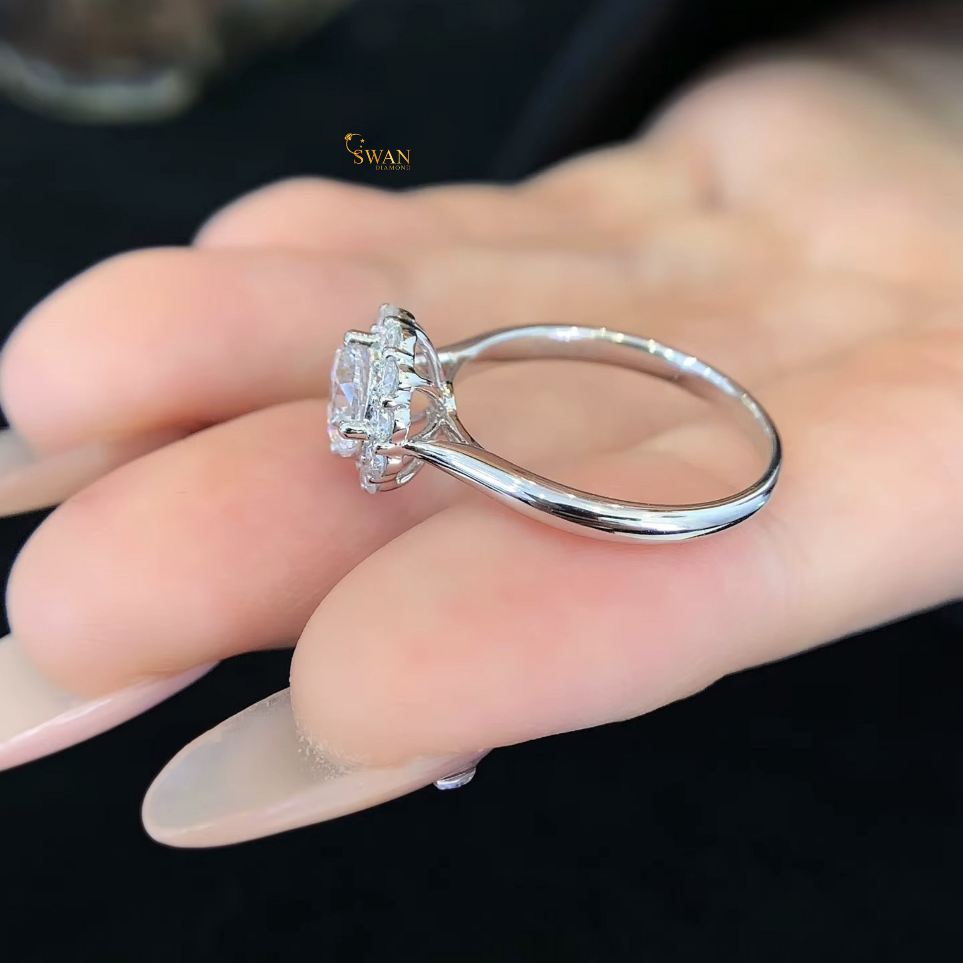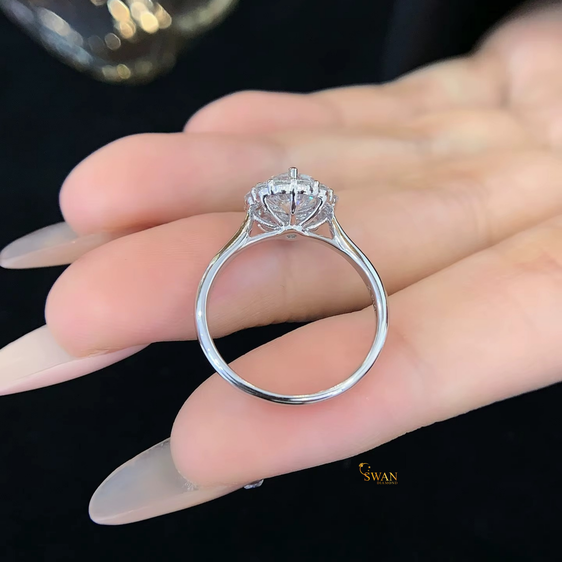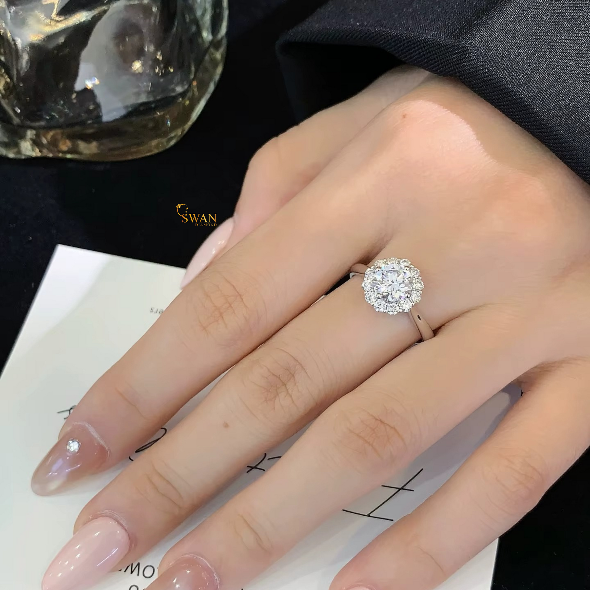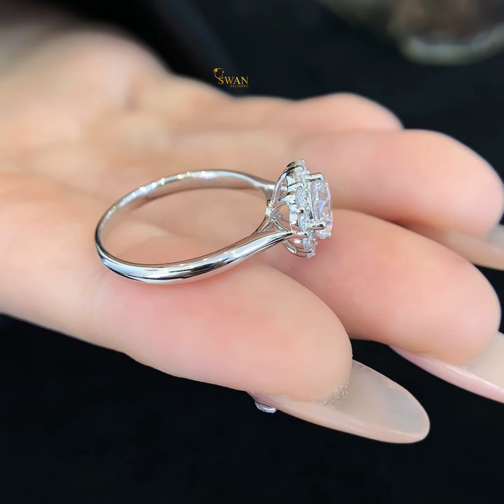 Round Cut Diamond Halo Engagement Ring in Solid White Gold with Pavé Band Sparkling Solitaire Bridal Jewelry Anniversary Gift for Her swandiamond